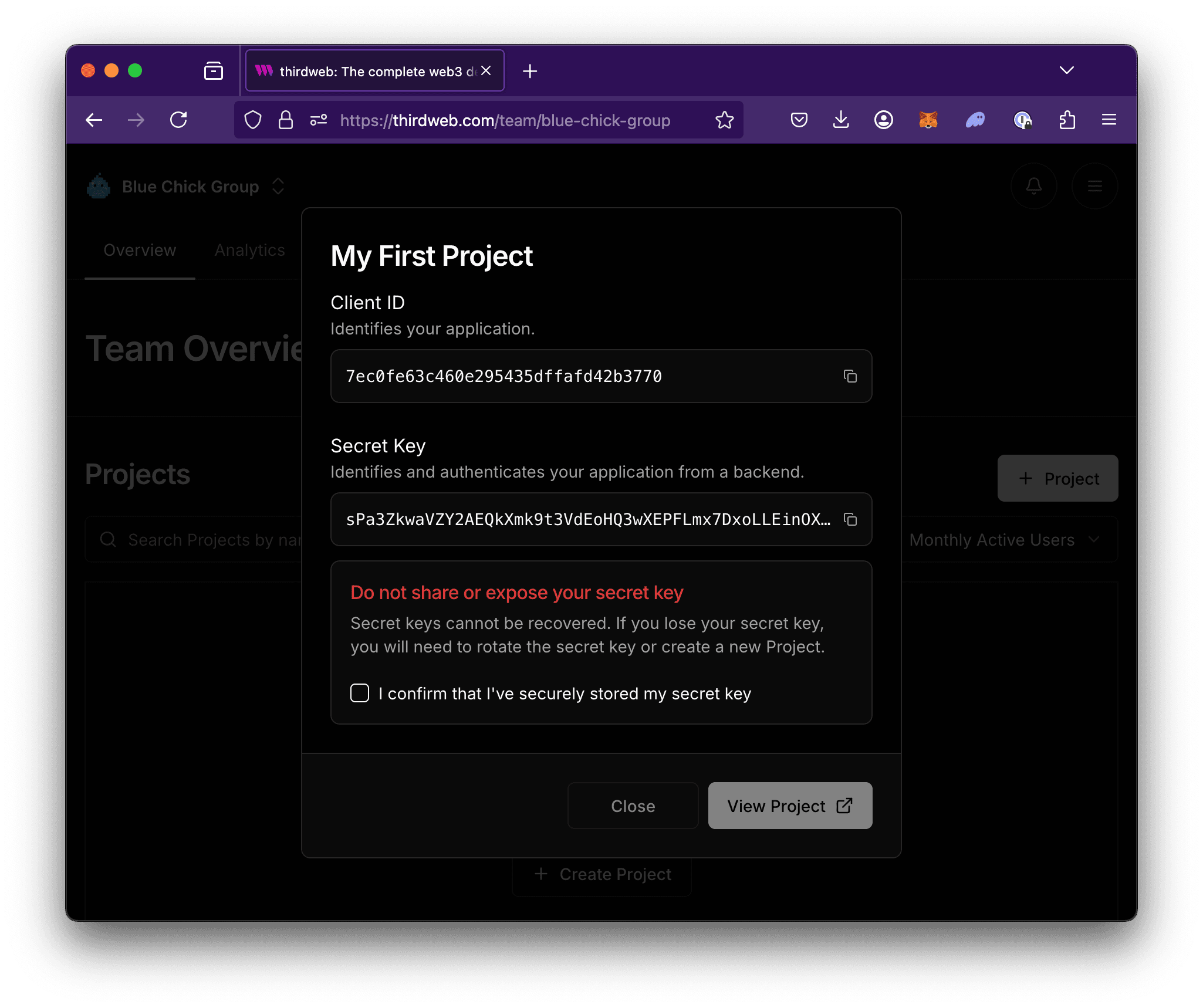 Create your first thirdweb project by selecting the "Create Project" button. You will be prompted to enter a project name and allowed domains.